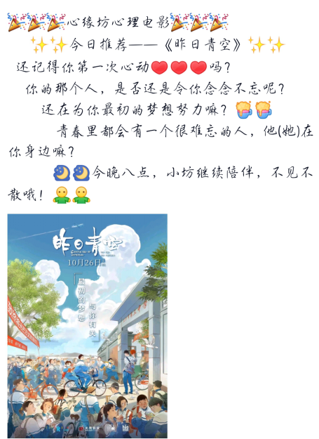 新的一周,陪伴继续。小坊在周五晚上20:00为同学们准时推送了口碑剧情俱佳的电影《昨日青空》。推送时小坊照例对该电影作简要介绍,并与心理联络员相互沟通,将电影推荐的影响发挥到最大。