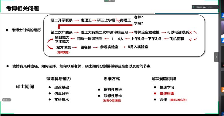 的刘淑杰等五位在读博士研究生,为同学们分享了博士申请、课题研究、博士生活等方面的感悟和经验。梁家豪同学重点为大家讲解了博士申请的几种途径及申请过程中的注意事项;孙淼同学和大家共同探讨了博士期间可能遇到的问题及解决思路;衡怡君、高宏飞同学鼓励同学们读博期间不要仅仅局限于论文,要通过参加会议、申请交流、旁听课程等方式提升眼界、开阔思路;刘淑杰同学为大家分享了人妻av