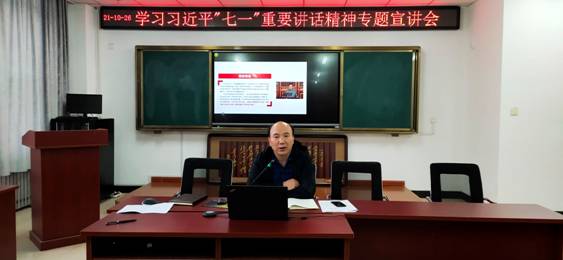 宣讲会上,赵树森同志紧扣习近平总书记“七一”讲话的主题,从中国共产党团结带领人民不懈奋斗的光辉历程和伟大成就、伟大建党精神、以史为鉴、开创未来的根本要求、寄语广大青年、代表党中央发出的伟大号召五个部分进行了解读。重点阐述了四个历史阶段的伟大成就和伟大意义;中国共产党伟大建党精神的深刻内涵和时代价值;以史为鉴、开创未来“九个必须”的根本要求。对广大党员教师进一步深刻理解和准确把握总书记讲话精神,领会总书记所提出的新思想、新观点、新目标,具有十分重要的指导意义。