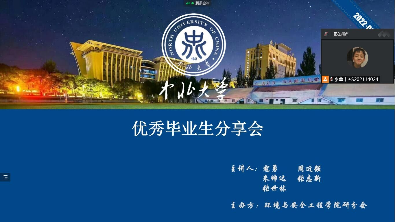 2022年6月21日下午4点,分享会于腾讯会议正式开始。即将前往南京理工大学、北京理工大学和同济大学攻读博士学位的寇勇、周近强、朱帅达和将入职兵器集团北化845厂、202所的张世林、张志新五位同学依次开讲,他们分享了自己在研究生学习、博士申请以及择业、就业中的宝贵经验,希望能对师弟师妹们有所帮助。